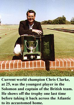 "An hour beyond the twilight of the last day of the Solomon Trophy test match between the U.S. and Great Britain," Rhys said, "Wayne Rodoni and Mik Mehas failed to complete the fifth and deciding game against David Openshaw and Ian Burridge. This left the final score of the contest at 16-4-1 and infuriated Mehas, who angrily proclaimed he would play until dawn if that's what it took to finish the match. Never mind that nobody could see the balls. "As this small and somewhat sour drama played out on the court, GB captain Chris Clarke stood on the sidelines, talking with U.S. captain Jerry Stark. 'Twenty years from now,' he said, 'people will remember that the Solomon was first played as a best-of-five competition in 1997.' "Clarke was looking at the big picture, understanding the test of time and the importance of history. From my point of view. the Mehas/Rodoni game was best left unfinished, even though it angered the American player. It tells the unfinished business between Great Britain and the United States in croquet. We're not done yet, and that's a good thing. Next year, when the Solomon resumes, we shall continue on our way."