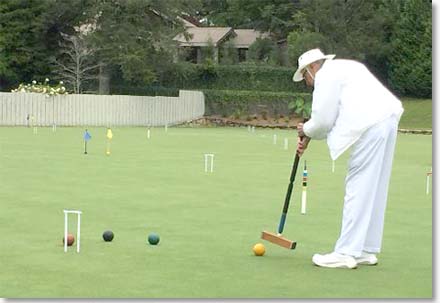 Most of the residents of these clubs return to warmer climes before the end of October. Before then, George Enochs plans to offer an Aussie Rules clinic at Lake Toxaway for two representatives from each of the other 11 mountain clubs..."so they can take the game back to their own clubs and teach it over the winter." John Curington, builder, owner, and manager of the seven-lawn Ponte Vedra club, told me he plans to change his introduction program to "one game of Golf Croquet, after which they switch to Aussie." He's also planning a series of lessons in Aussie Croquet at PVCC, with the other clubs nearby invited to attend. Meanwhile, on the other side of the globe.... Impressed with his own results in America, Nicholls took the game back to his club in Wagga-Wagga, where a group of players there quickly started regular winter-time play with the game. When people ask about his four-month sojourn in north Florida, one of the big items is Aussie Croquet. He writes from Australia, "I'll be heading to Brisbane next weekend (for the Australian Croquet Association board meeting) and will have the opportunity to discuss the various ways in which clubs are utilising different versions of croquet to attract and build (and retain) club memberships and develop player skills."