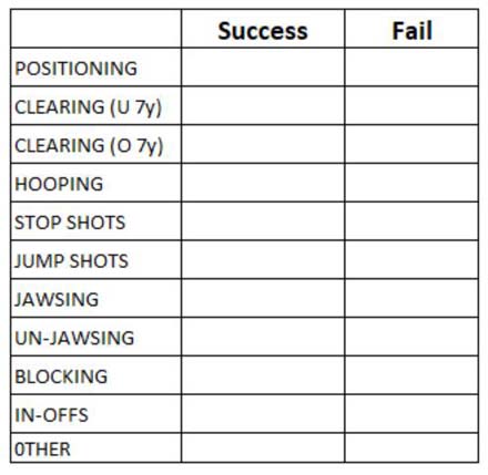 How to code games The grid is simple - for each stroke, the analyst must make their best judgement of the intent of the player and decide if the player was successful, or unsuccessful, in achieving that stroke. Having done this, a mark is added to the box that corresponds to that assessment. At the end of the game the number of marks in each box is counted, and we now have data to carry out a full analysis of the game. For example, we can determine the proportion of strokes in the game where jump strokes were attempted, the proportion of failed attempts at playing a ball into the jaws of the hoop, and how many strokes in total were successful in the game.