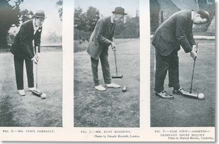 On the full roll shot: "Your hands must be right in front of the head of the mallet. They should remain so until well after the balls have gone. At the finish they should be well above the head of the mallet. The wrists should be as rigid as possible. In the Irish style the hands should be well in front of the shaft. This allows the fingers to draw or sweep the mallet through. If much power is required, it is the stomach muscles that must supply it mostly." On running hoops: "I particularly caution the player against moving his head and shoulders. It is the mallet head which should move and the movement of "everything else" should be reduced to a minimum. . . .The mallet should be drawn back quite slowly, toe first, along the ground, before being raised at all. The wrists should, on no account, be allowed to bend in the up sweep more than they were when the ball was at rest." On the split shot: "Right-handed players will always find a greater difficulty in being accurate when their own ball has to go to the left. They will find it far more difficult in this shot to follow through dead true on the "Line of Force." There will always be a great temptation to follow-through too much on to the point where the Pilot has to go. . . .Try to imagine the Pilot ball is a wall, and that you are driving your own ball against it. If you drive your ball at a dead right angle to the wall (dead opposite to you) your ball will return direct to you. If you drive your ball to either the right or the left of the spot dead opposite to you on the wall, your ball may be said to hit the wall at an angle. The ball will return towards you, but it will leave the wall at exactly the same angle at which it hit it, and will arrive to one side of you at a point which is exactly twice as far from you as the point on the wall dead opposite to you. In other words it will glance off further to the side than ever. This is exactly what happens in a split shot." Other tidbits from Tollemache: "The careful, cautious player [Aunt Emma, though he never uses the term], is the 'cancer and tuberculosis' of croquet. It is an insidious disease, easily caught and difficult to cure." [Hitting your ball] is "the only difficult thing to do in croquet." "If you want to be first class, you must be content to lose game after game in the effort to do things the right way." "The cause of nerves is mostly ignorance." "Train yourself from the very start to play each separate shot as perfectly as possible." "However simple a shot, try to make a fine art of it." "The painstaking player is the man who takes infinite pains to play each shot by exactly the right method with absolute accuracy. . .to produce a perfect shot every time. This is only way to get to the top." Croquet's copious and amusing photographs instruct the reader every step of way.