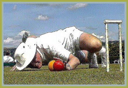 | Photographer Tim King does not identify the player, who on his follow-through achieves the half-pointe--often executed by ballet dancers, but seldom seen on the croquet lawn. [better view]