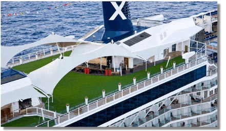 | The new Celebrity Equinox at sea. The huge grass lawn in the rear of Deck 15 is barely visible from this distance beneath its partial covering.