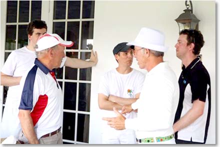 While the rules of Peel Croquet did not change, Howard clearly enjoyed the many conferences with the players as they continued to experiment with different rules in the Two Shot Golf Croquet game--sometimes chatting on the veranda or in a courtside gazebo, sometimes meeting in the center of the court during a game to examine and explore different options in particular situations.