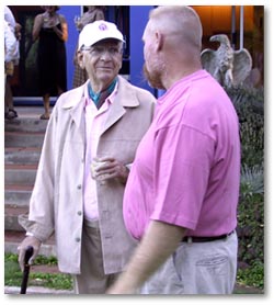 | Holding the remnants of his "McClatchy" cocktail, Ellery is obviously enjoying a chat with Jerry Stark. Jerry was usually the tournament director of Ellery's spectacular annual fall invitational. Erv Peterson photo.