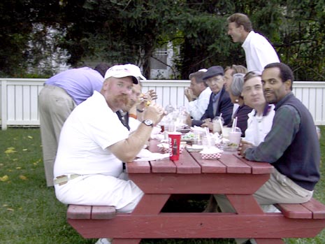 Ellery waits patiently for his turn, standing inches outside the boundary string, and not far from chairs on the boundary shaded by Italian plum trees. Erv Peterson photo.